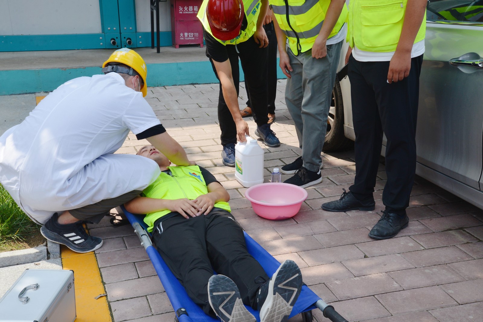 培训会后,现场组织了高温中暑应急演练。中午12时,随着“报告,发现一名员工中暑晕倒”的一声呼叫,演练正式开始。保管员发现人员倒地,初步判断倒地者出现了中暑症状,立即向班组长汇报了现场情况并通知安全员。应急小组立即带上急救药箱、毛巾奔赴现场,迅速判断病情,开始急救:搬移→降温→补水→促醒→送医,每个步骤都有条不紊,演练达到了预期效果,取得了圆满成功,获得了现场人员的一致好评。